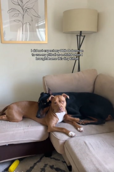 In the end, the Doberman, the Pit Bull, and the tiny foster kitten weren’t just sharing space.
