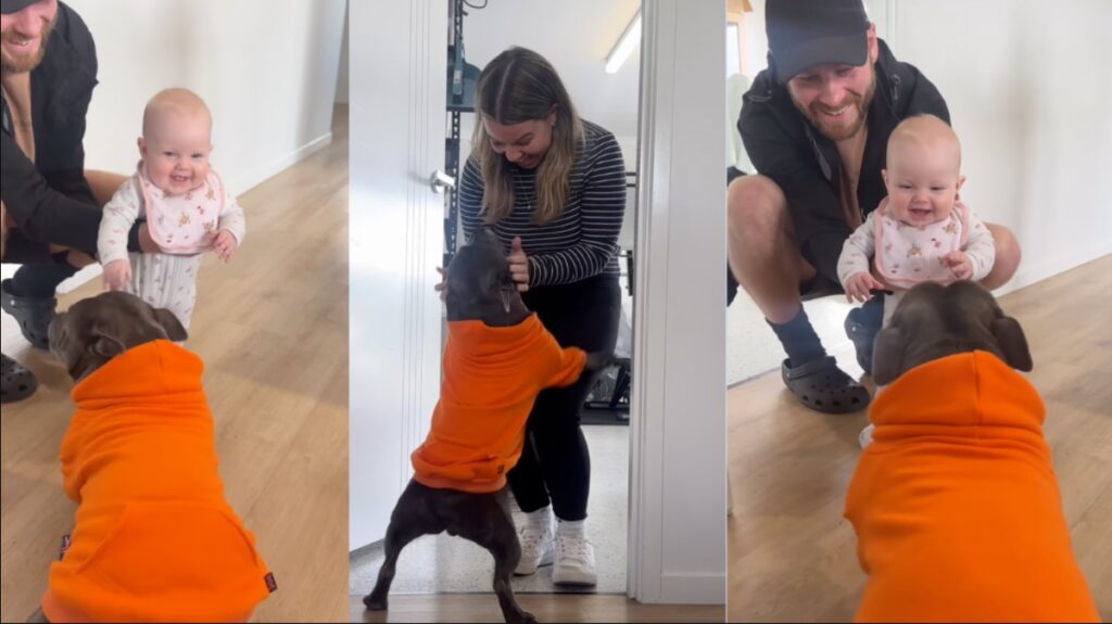 And then the magic happens: the baby notices. At first, she looks cautious. After all, seeing a big, bouncing Staffy charging with excitement could be overwhelming for a little one.