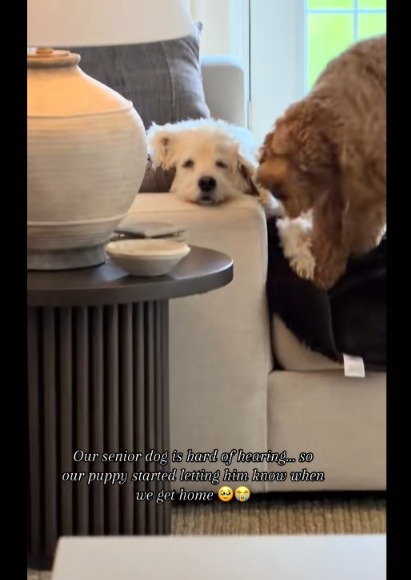 The senior dog, who apparently struggles to hear, lifts his head, blinks, stretches, and follows his young friend to the door.