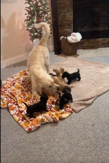 It’s the kind of scene that makes hearts melt and smiles widen without warning. As each puppy climbs over the big retriever and leans in for yet another lick, their dad doesn’t flinch — he doesn’t look confused or overwhelmed.