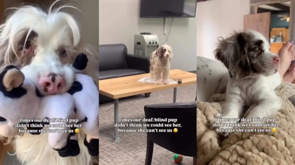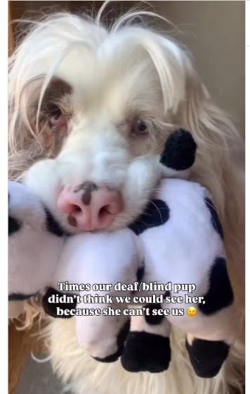 Set to a whimsical “Che La Luna” soundtrack, the video opens with a message on screen: “Times our deaf/blind pup didn’t think we could see her, because she can’t see us.”