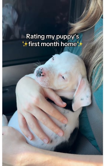 The now-viral clip begins with Poe fast asleep in his mom’s arms — a peaceful, snoring ball of wrinkles — as the onscreen text reads: “Rating my puppy’s first month home.” From there, the fun begins.