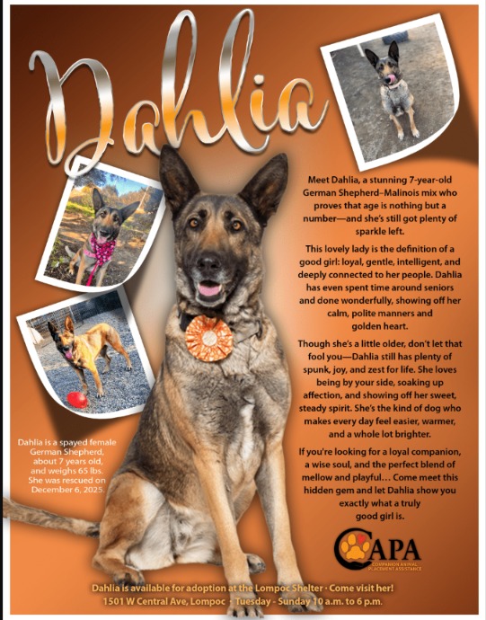 Dahlia is currently available for adoption through the Lompoc Animal Center, part of Santa Barbara County Animal Services, in California. The shelter works with Companion Animal Placement Assistance (CAPA) — a volunteer nonprofit organization dedicated to supporting the medical and behavioral needs of shelter animals — to help dogs like Dahlia find the right homes.