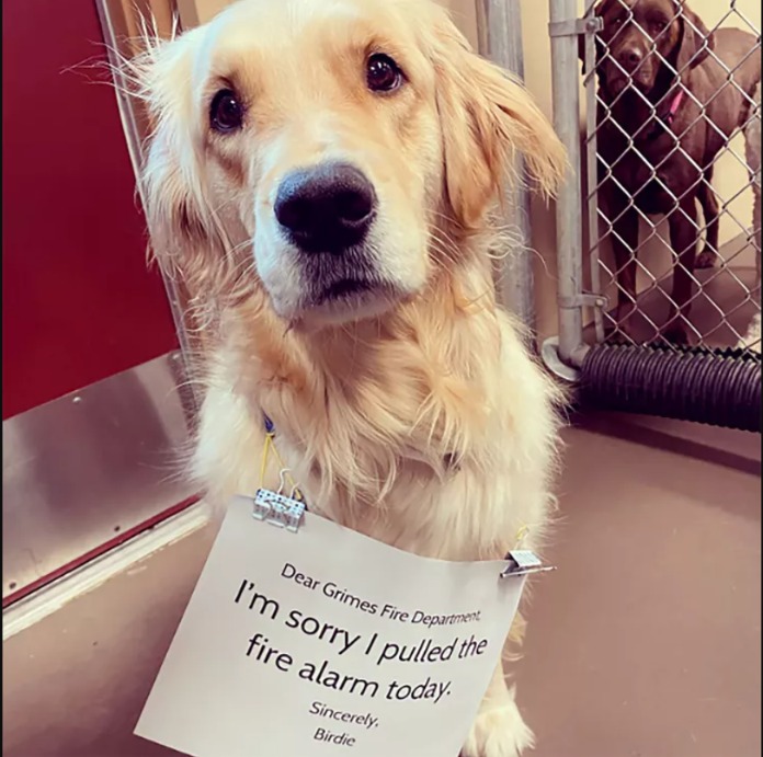 In the picture, she’s wearing a sign around her neck that reads, “I’m sorry I pulled the fire alarm today.”