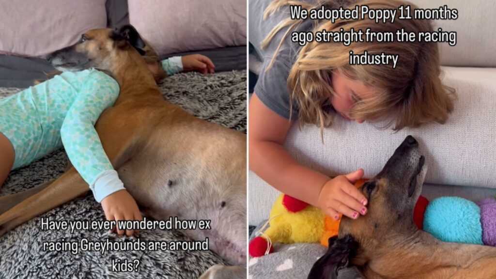 In a touching video from Australia, Poppy — an adopted ex-racing Greyhound — is seen cuddling, leaning in, and standing guard over the little girl in her family.