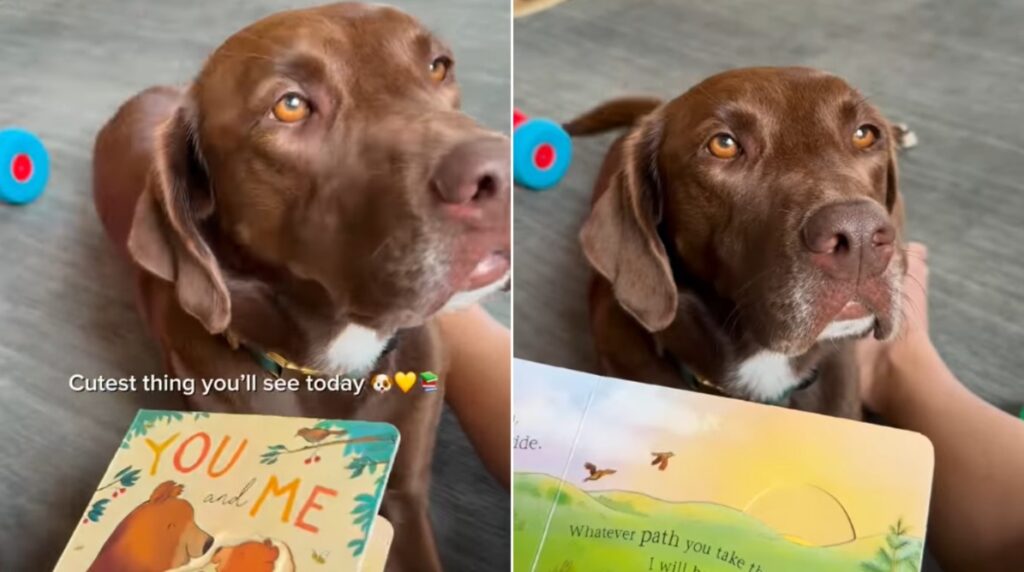 Her tail gives one slow wag before she leans in, eyes fixed on the book, ears twitching with every change in Mom’s tone.