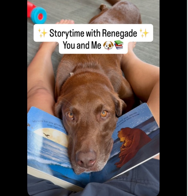 When the pages turn tender — when the book speaks of love, patience, and connection — Renegade lowers her head, resting it gently on Mom’s knee.