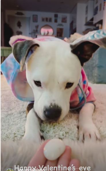 With a treat in hand and a hopeful smile, she offered Kora Luna a kind of “proposal” — a fun symbol of inviting her to stay for good. When Kora Luna happily accepted (treat in mouth and all), it was official: the foster fail had become a forever family.