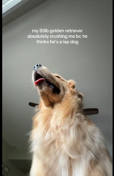 His mom even captions it perfectly: “My 85 lb. Golden Retriever absolutely crushing me because he thinks he’s a lapdog.”