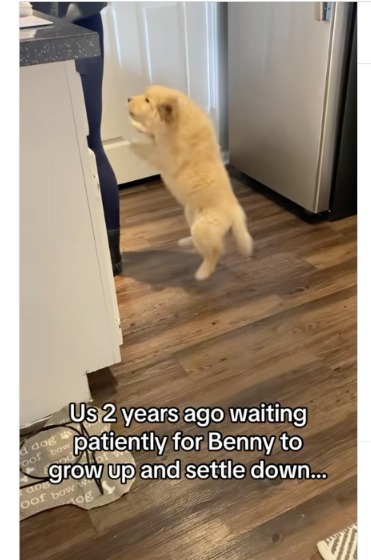 Then, the video cuts to the present — Benny is now a full-sized, 70-pound golden retriever, but his energy level hasn’t changed one bit.