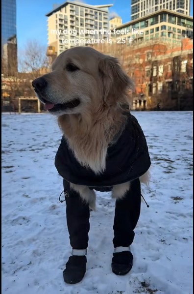 For most dogs, especially those with thick fur like Golden Retrievers, a bit of snow can be fun — but that doesn’t mean their humans don’t take extra precautions in dangerous cold. Enter Burrow, a Golden Retriever whose mom made sure he was fit for the Arctic‑like weather before heading out.
