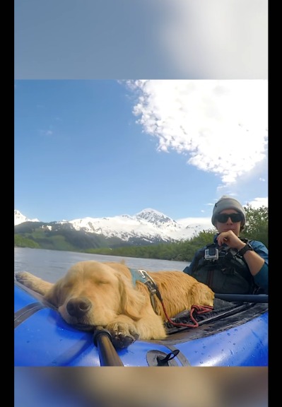 There are adventurers… and then there’s Kicker, a golden retriever puppy who proved that sometimes the bravest thing you can do is close your eyes and let yourself drift — even while kayaking through a glacier river.