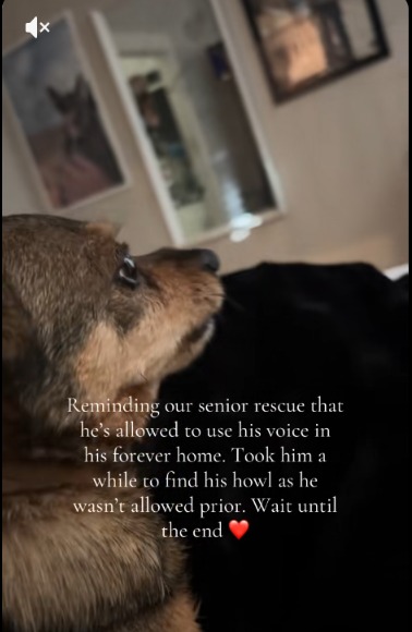 The purpose of this exercise wasn’t just fun—it was deeply symbolic. The text on the screen explained it plainly: “Reminding our senior rescue that he’s allowed to use his voice in his forever home.”