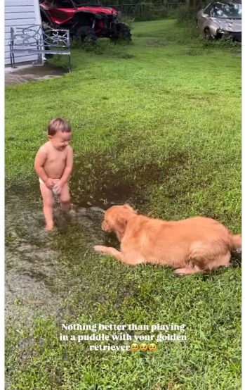 In a world full of screens, schedules, and constant noise, this little clip stands out because it’s so refreshingly simple. It’s a boy, his dog, and a puddle.