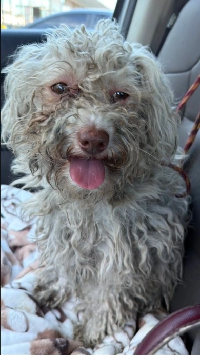 Tucker wasn’t just dirty — he was completely matted, his fur tangled and hardened from neglect. For a dog, extremely matted fur isn’t just unsightly; it can be painful, restrictive, and even dangerous, cutting off circulation and hiding infections or injuries.