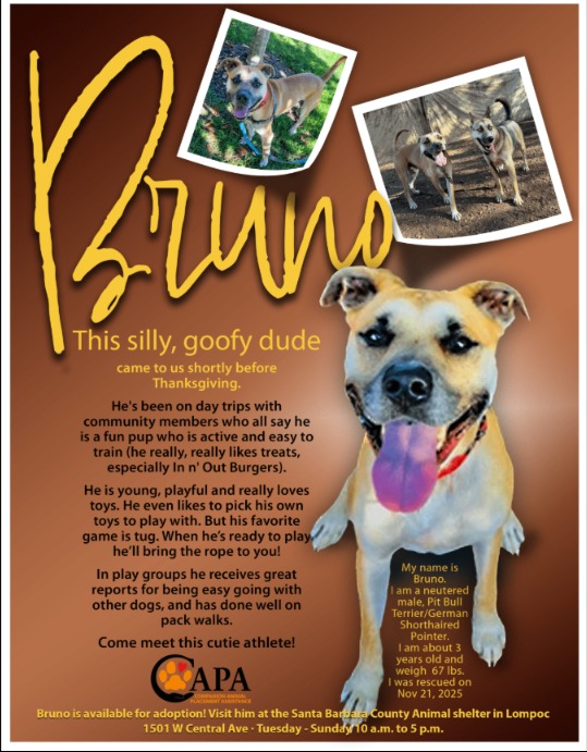 If you’re considering adoption and feel Bruno’s personality might be the right fit for your life, the Lompoc Animal Center invites you to stop by and meet him in person. They’re open Tuesday through Sunday, and the friendly staff is ready to answer questions about Bruno or other adoptable animals in Santa Barbara County.