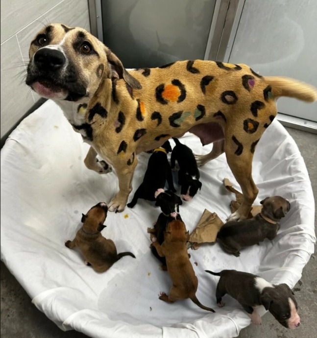 When Arizona Humane Society (AHS) showed up, investigators realized the “wild animal” was in fact a 5-year-old pit bull terrier mix now named Rainbow Brite, her coat painted with colorful spots to resemble a leopard.