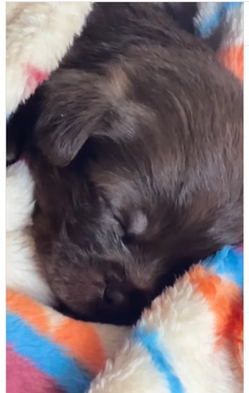 The puppy once abandoned to coyotes and strangers is now curled up safe in blankets, learning what love actually feels like.