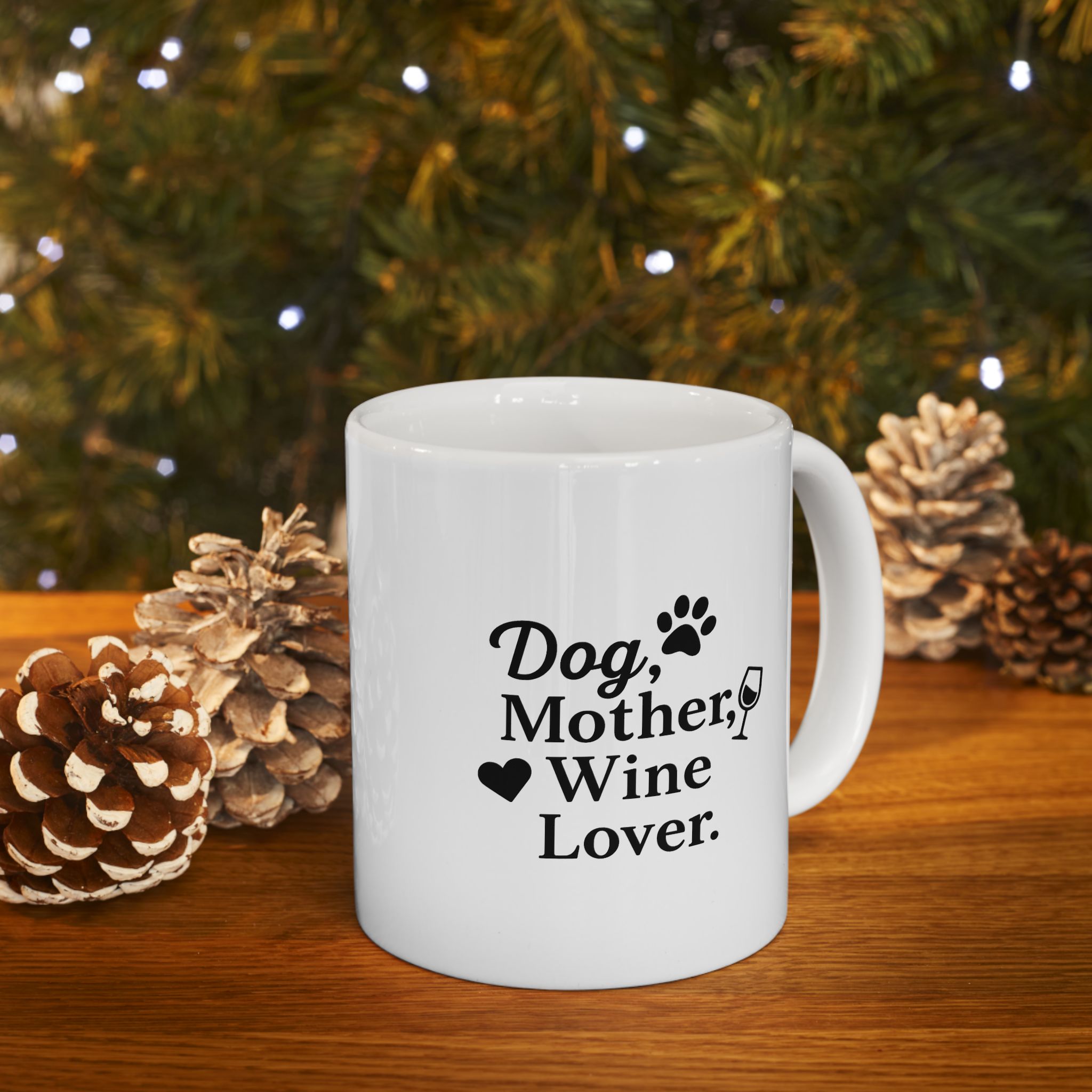 Show off your love for dogs with our "Dog Mother, Wine Lover" Mug. Whether you're starting your day or winding down, this 11-ounce ceramic mug is your perfect companion for coffee, tea, or hot chocolate.