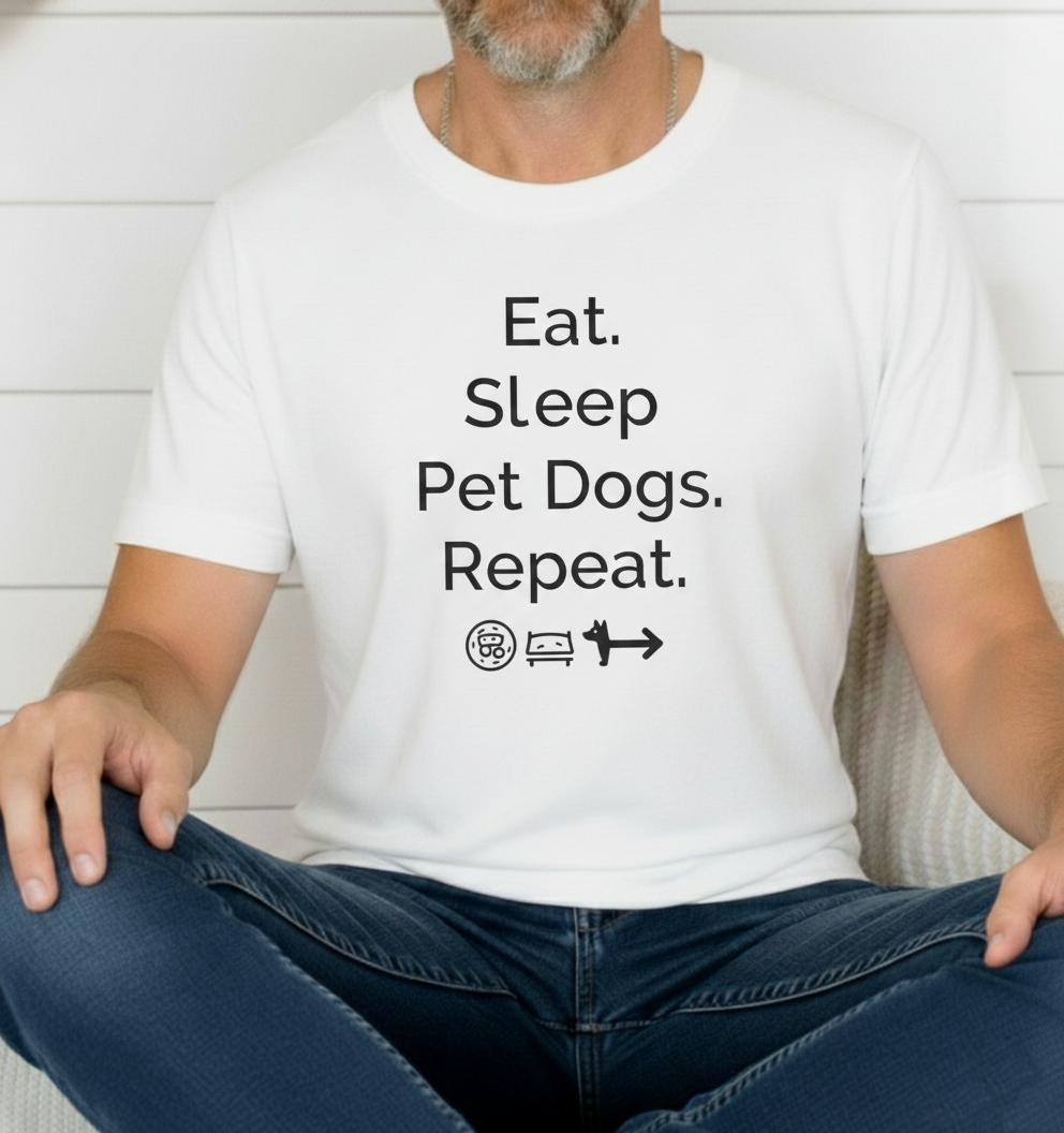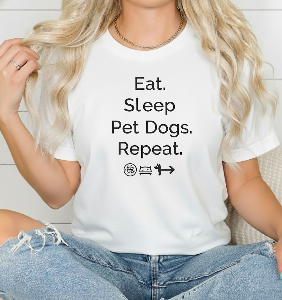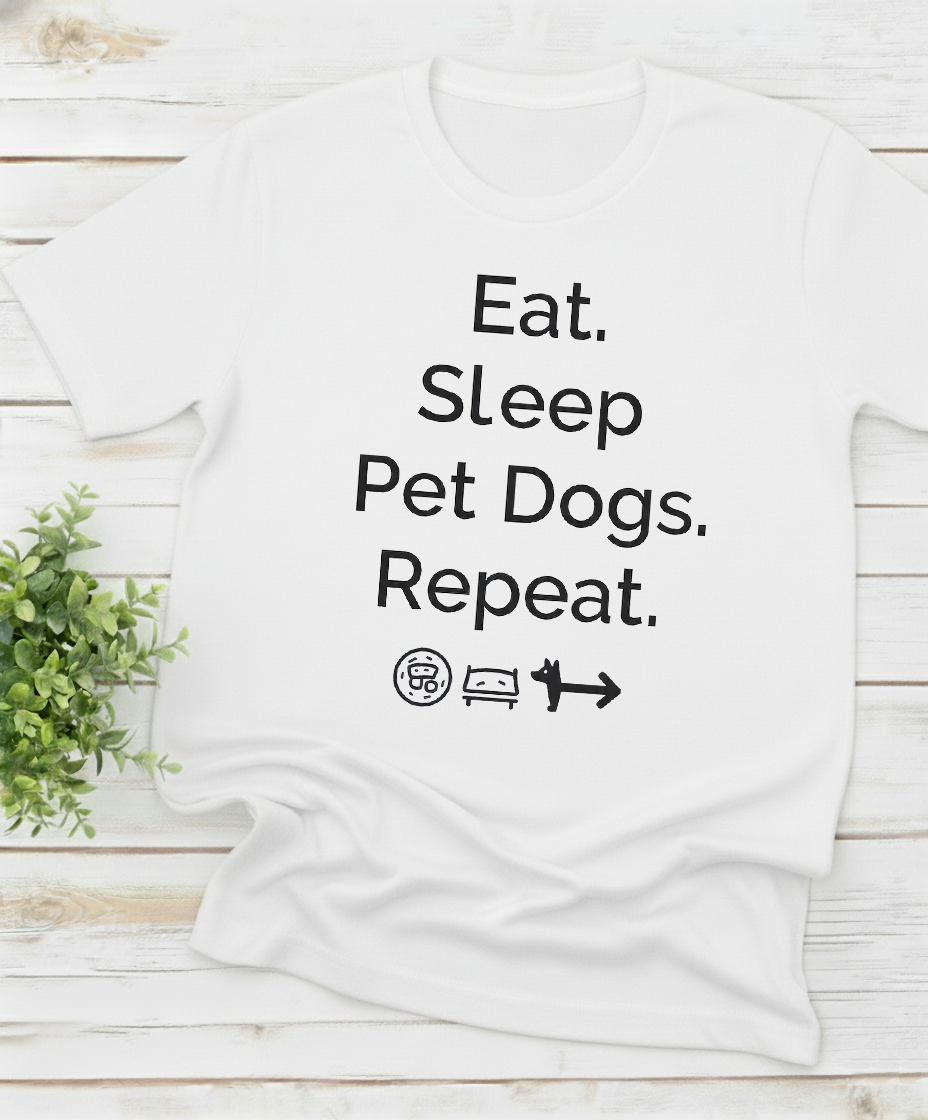Show off your love for dogs with our “Eat. Sleep. Pet Dogs. Repeat.” tee. Made from premium, soft cotton that feels as good as puppy snuggles. Perfect for walks, lounging, or any casual day where you want to wear your heart (and humor) on your sleeve.