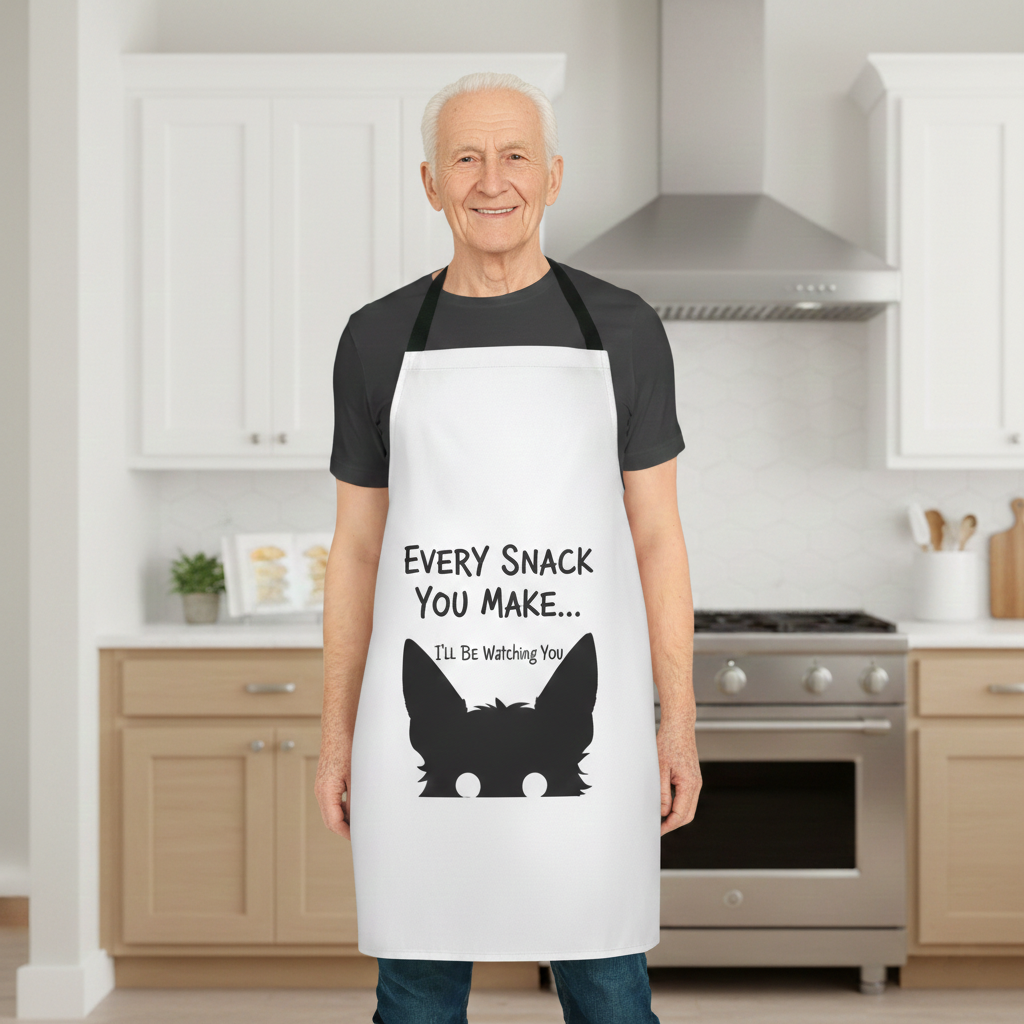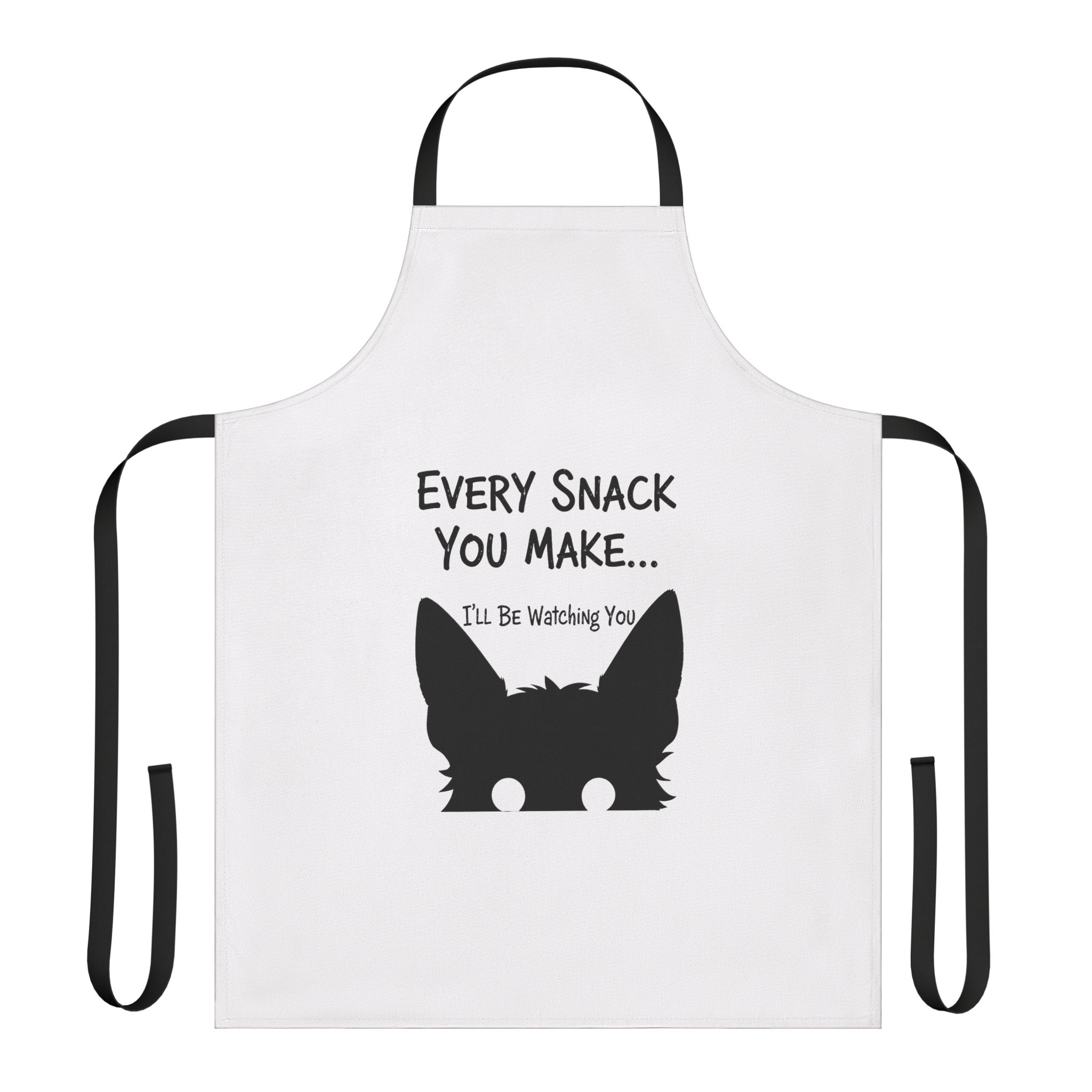 Show off your love for dogs with our “Every Snack You Make… I’ll Be Watching You” apron. Let the home cook shine in the kitchen with a touch of character, the dog personalized chef’s apron. This apron comes with a tie-back closure to fit securely, a sewn-in care label for guesswork-free maintenance, and a highly durable 100% polyester canvas construction for top-tier durability. It comes in one size: 31.5″ x 25.6″.