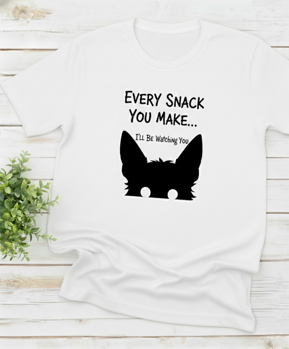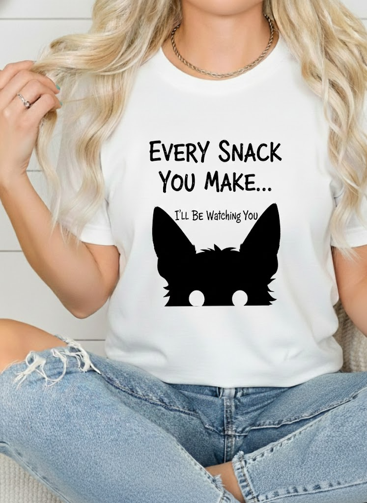 Show off your love for dogs with our “Every Snack You Make… I’ll Be Watching You” tee. Made from premium, soft cotton that feels as good as puppy snuggles. Perfect for walks, lounging, or any casual day where you want to wear your heart (and humor) on your sleeve.