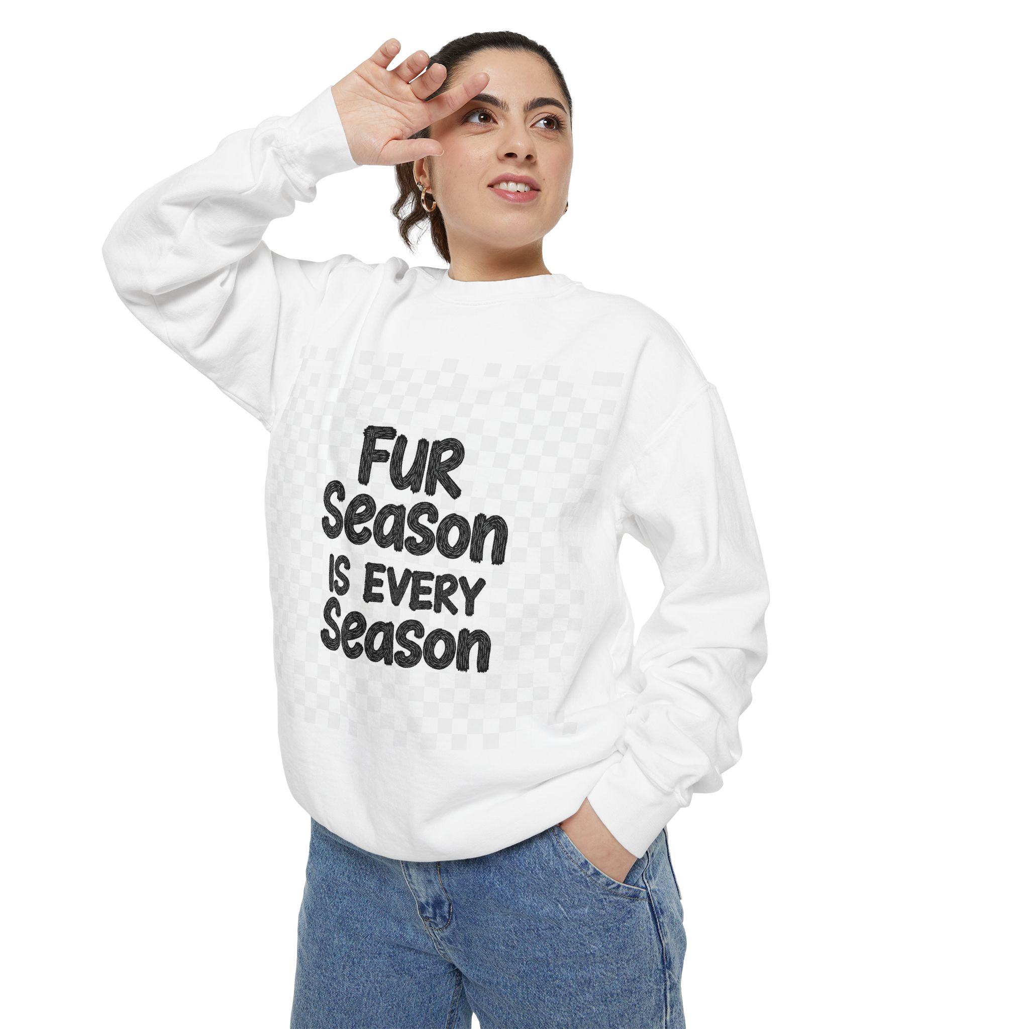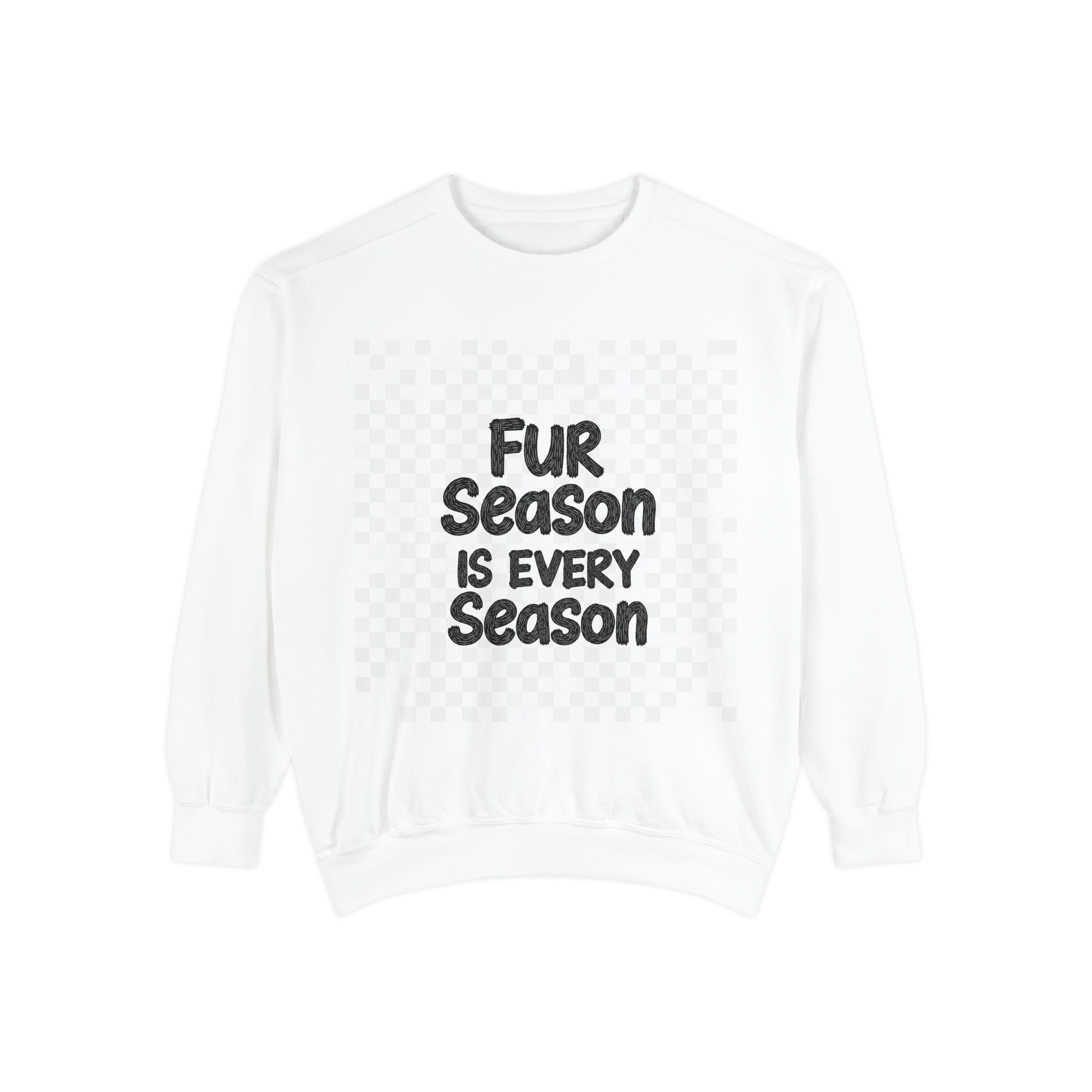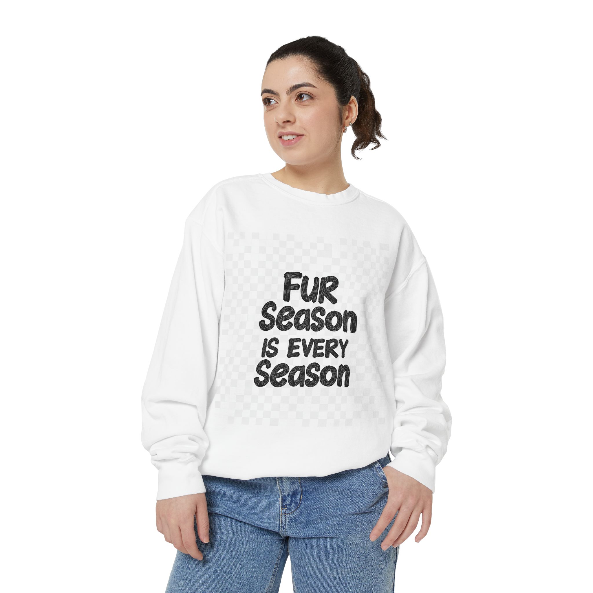 Show off your love for dogs with our "Fur Season is Every Season" sweatshirt. Luxurious comfort and style are what this unisex, garment-dyed sweatshirt is all about. It's made with 80% ring-spun cotton and 20% polyester and the fabric is 3-end garment-dyed, ring-spun, color-blast fleece with a 100% cotton face. Each sweatshirt comes with a relaxed fit, a rolled-forward shoulder, and a back neck patch.