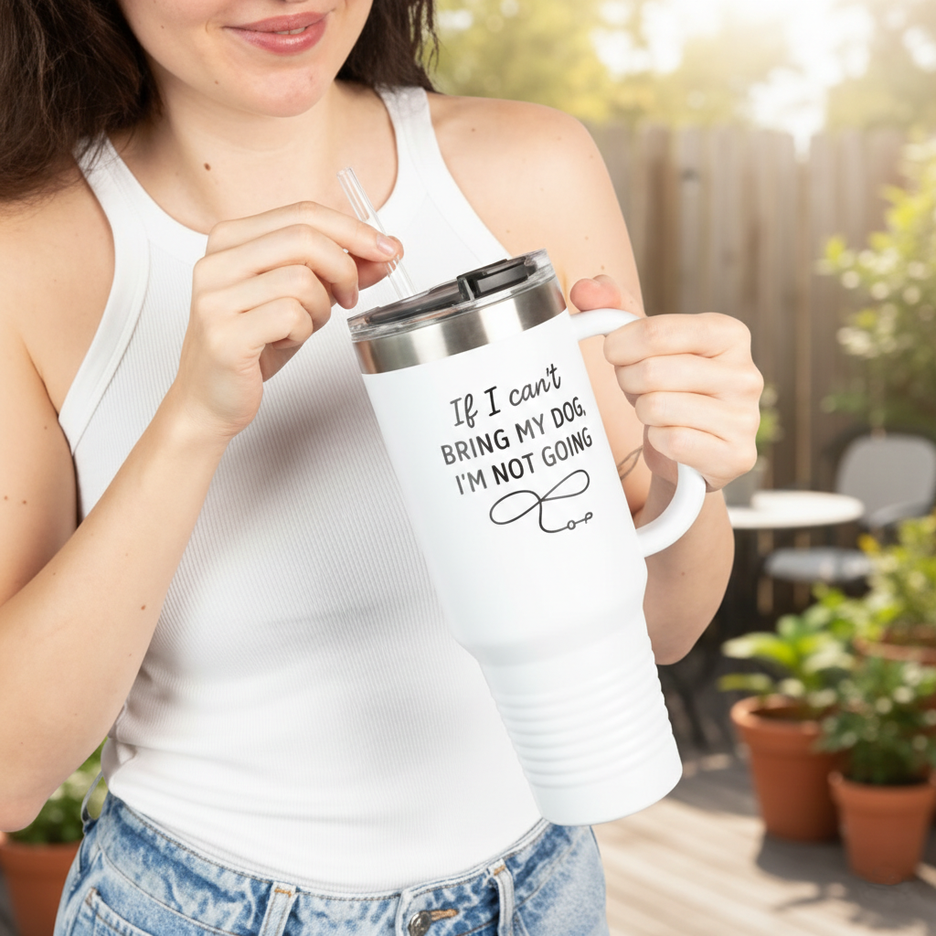 Show off your love for dogs with our “If I Can’t Bring My Dog, I’m Not Going” travel mug. Crafted for adventure, this insulated mug boasts a rugged 100% stainless steel body and comes with a convenient straw and lid for easy sipping on the go. Its generous 40oz (1.18L) capacity ensures you stay hydrated, while double-wall insulation keeps your drinks at the ideal temperature for hours. Finished with a sleek powder-coated exterior, it’s the perfect blend of durability, style, and dog-loving spirit.