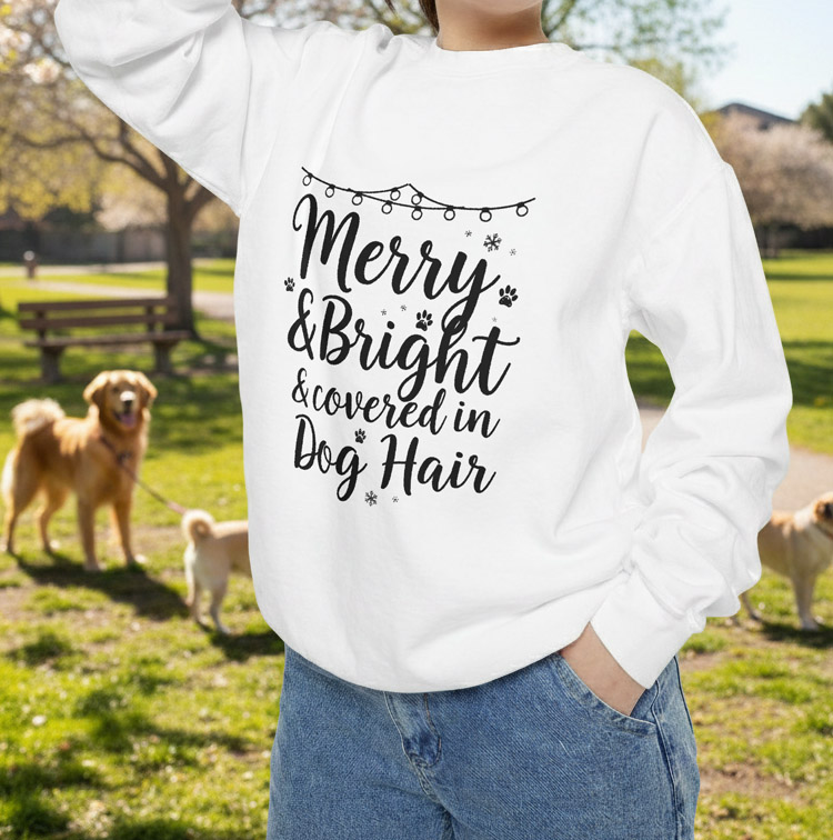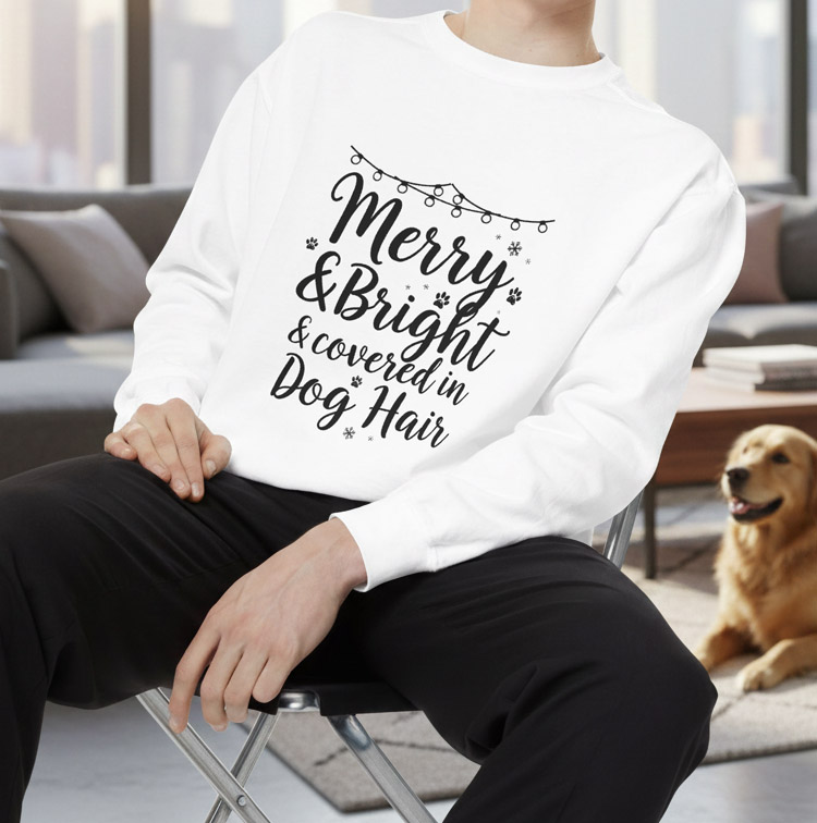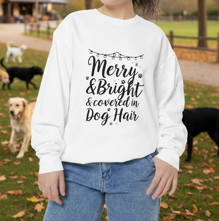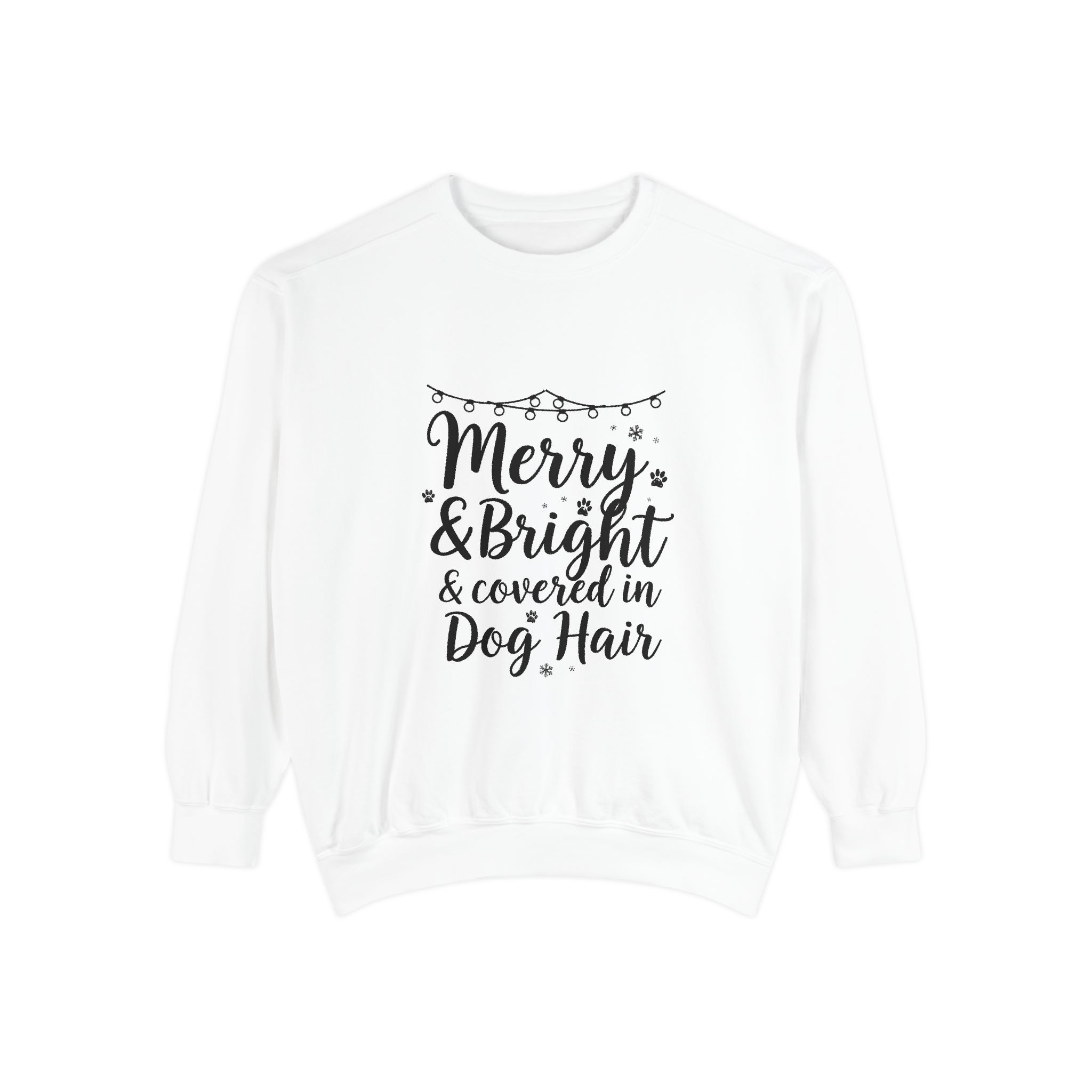 Show off your love for dogs with our “Merry & Bright & Covered in Dog Hair” sweatshirt. Luxurious comfort and style are what this unisex, garment-dyed sweatshirt is all about. It’s made with 80% ring-spun cotton and 20% polyester and the fabric is 3-end garment-dyed, ring-spun, color-blast fleece with a 100% cotton face. Each sweatshirt comes with a relaxed fit, a rolled-forward shoulder, and a back neck patch.