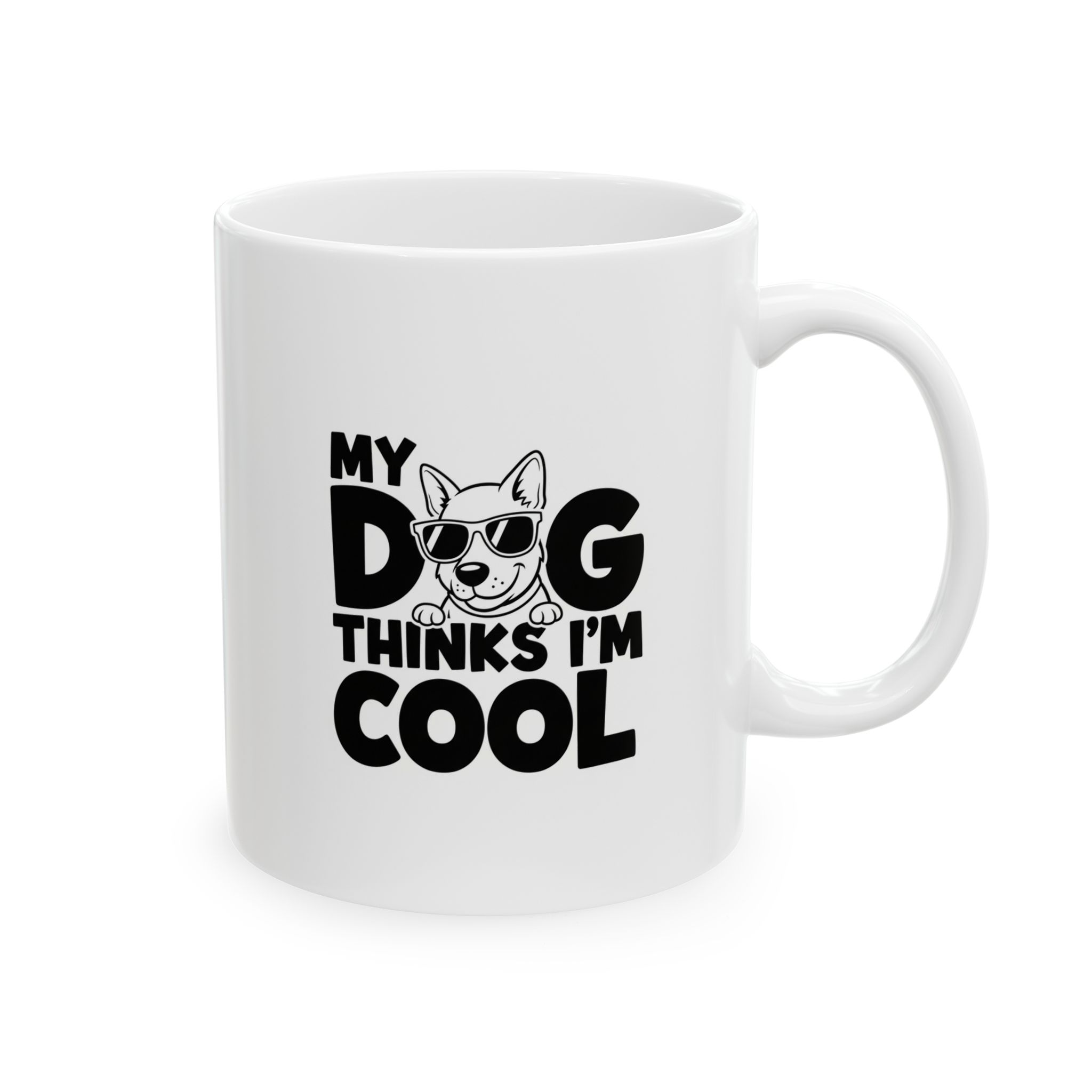Show off your love for dogs with our “My Dog Thinks I’m Cool” Mug. Whether you’re starting your day or winding down, this 11-ounce ceramic mug is your perfect companion for coffee, tea, or hot chocolate.