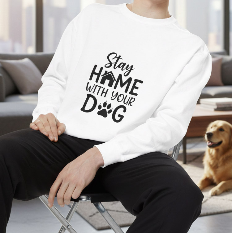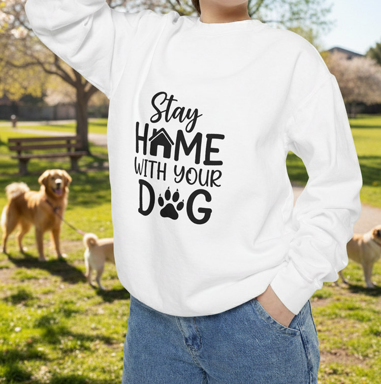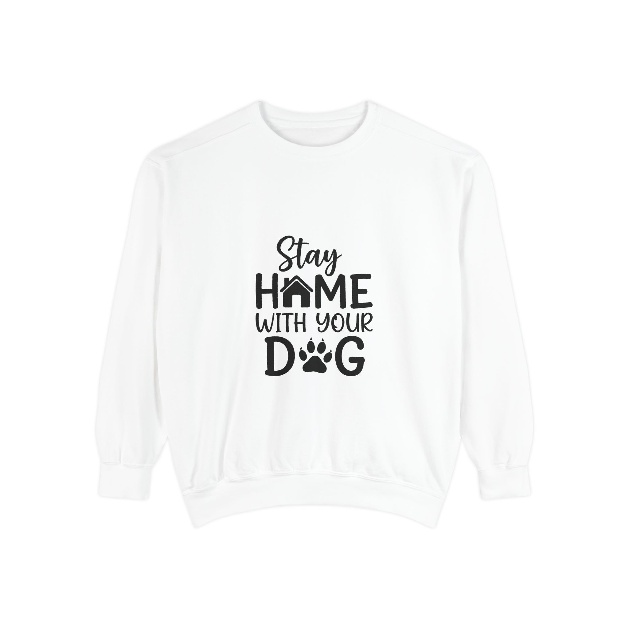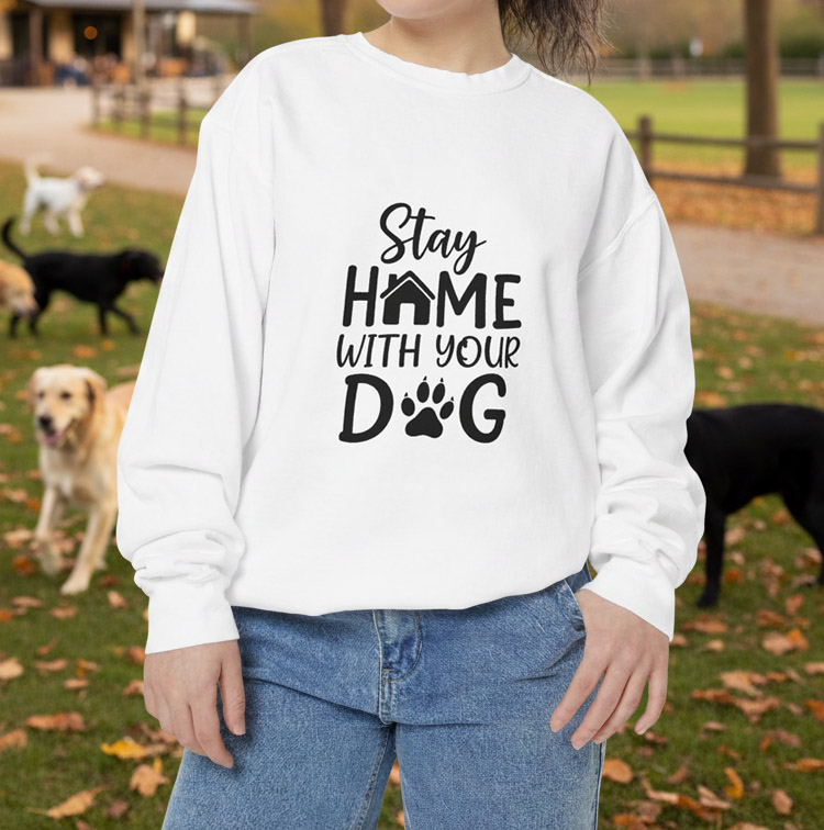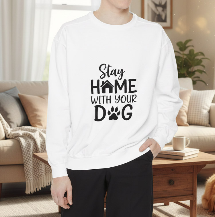 Show off your love for dogs with our “Stay Home with Your Dog” sweatshirt. Luxurious comfort and style are what this unisex, garment-dyed sweatshirt is all about. It’s made with 80% ring-spun cotton and 20% polyester and the fabric is 3-end garment-dyed, ring-spun, color-blast fleece with a 100% cotton face. Each sweatshirt comes with a relaxed fit, a rolled-forward shoulder, and a back neck patch.