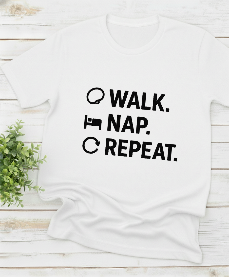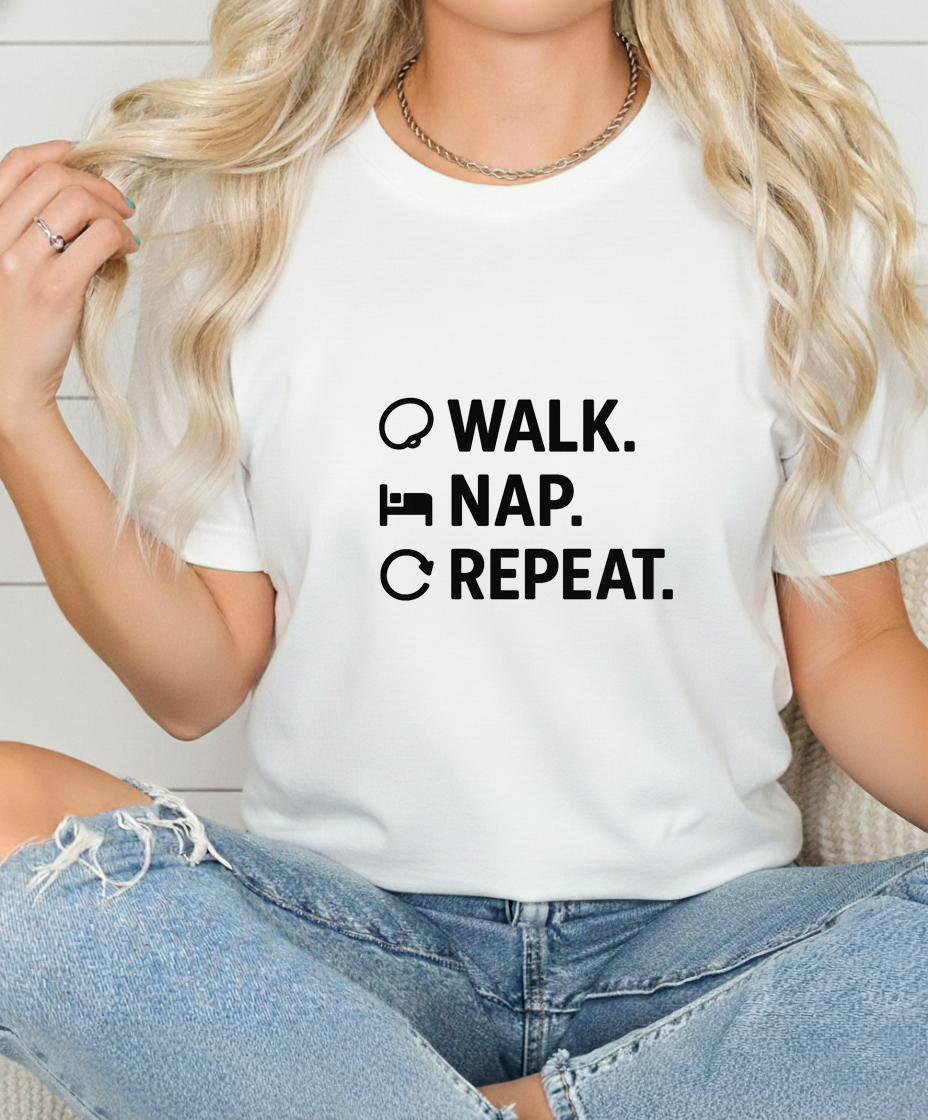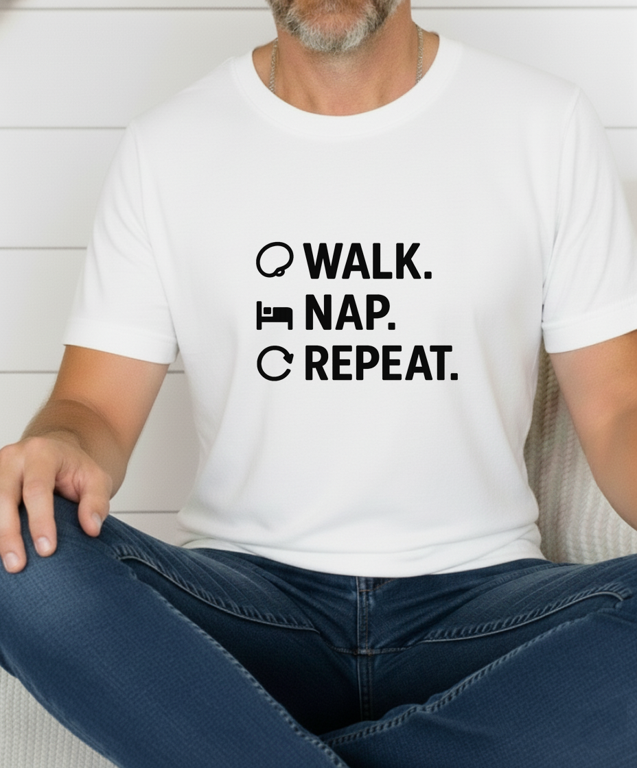 Show off your love for dogs with our “Walk. Nap. Repeat.” tee. Made from premium, soft cotton that feels as good as puppy snuggles. Perfect for walks, lounging, or any casual day where you want to wear your heart (and humor) on your sleeve.