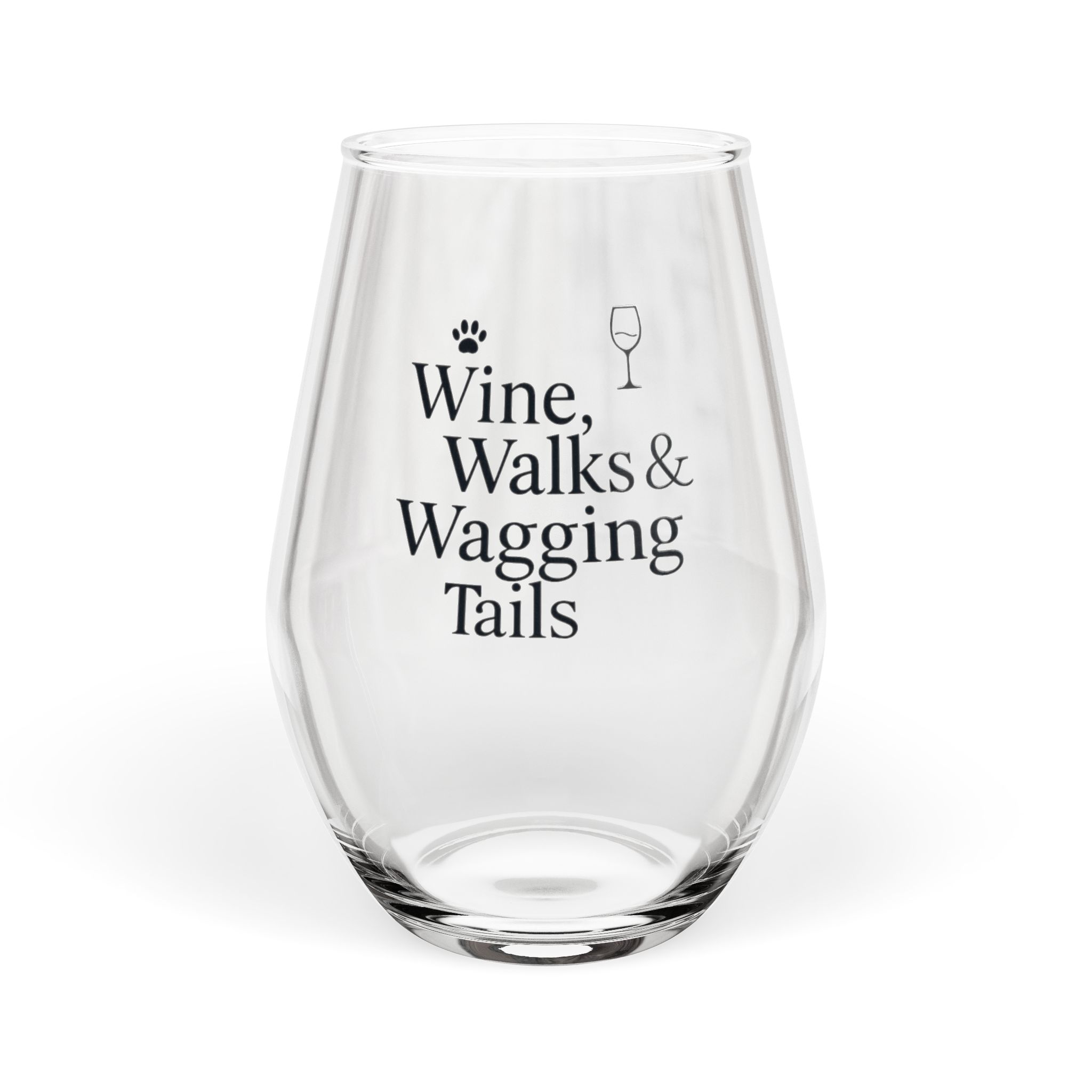 Show off your love for dogs with our “Wine, Walks & Wagging Tails” stemless wine glass. Whether it’s weddings, parties, or beautiful evenings with friends and family, this personalized stemless glass wine fits right in. With its sleek, stemless design, each glass holds 11.75oz of your favorite wine. Add your art and create a kitchen classic.