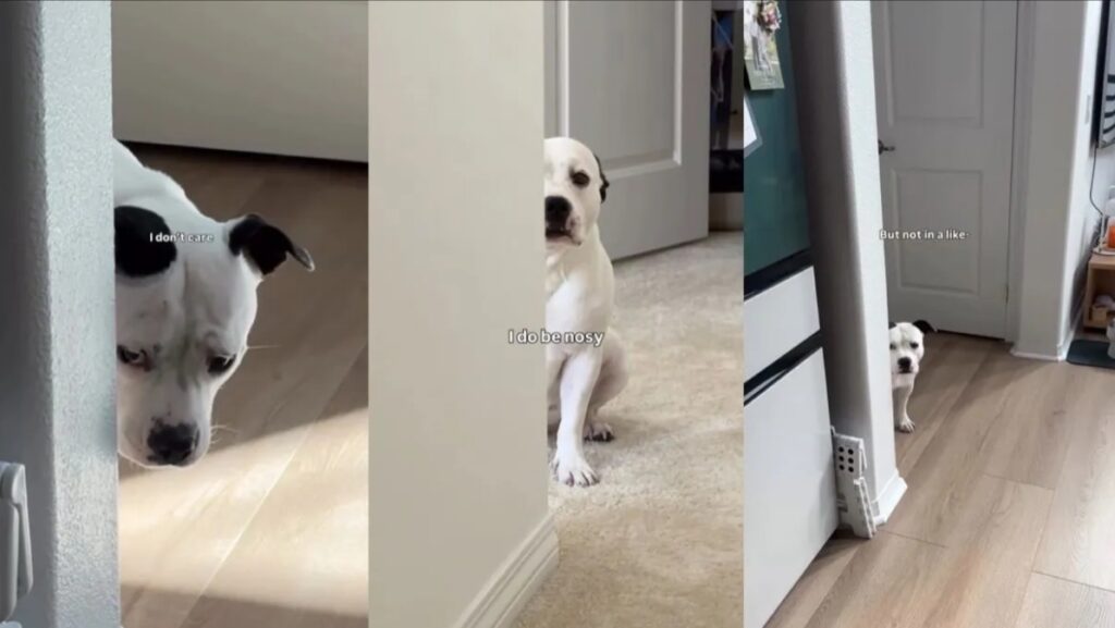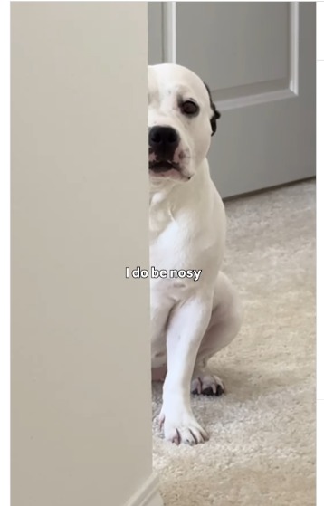 In a clip shared by her owner (@rosiethestaffygirl), Rosie peeks out from behind a wall, one curious eye fixed on her human.