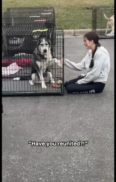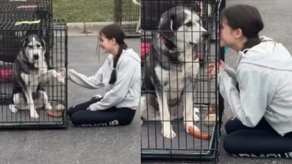 Then came the kisses, pressed gently against her face through the kennel. No barking. No frantic jumping. Just pure, patient love.