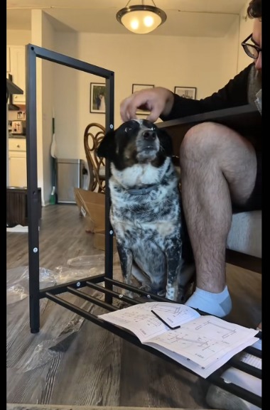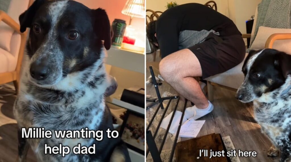 Her ears twitch every time he picks up a new tool, her head tilts whenever he moves something, and her expression says it all: “Are you sure that’s how it’s supposed to go, Dad?”