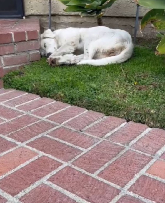 But what she found wasn’t their backyard routine—it was an unexpected scene. Lying curled in the grass, unmoving, was a stray dog.
