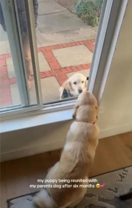 The clip begins quietly. Mochi sits inside, close to a bright window, her gaze fixed on the world outside. On the other side of the glass, another Golden Retriever — her grandma’s dog and longtime friend — approaches.