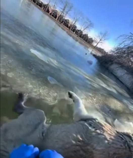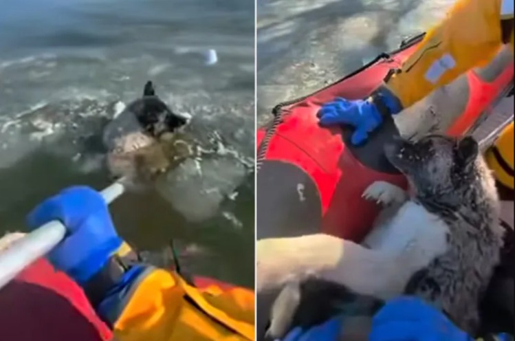 Footage shared by the department shows the rescue crew approaching the stranded animal in a small craft, carefully maneuvering through icy water and fragmented sheets of freezing ice.