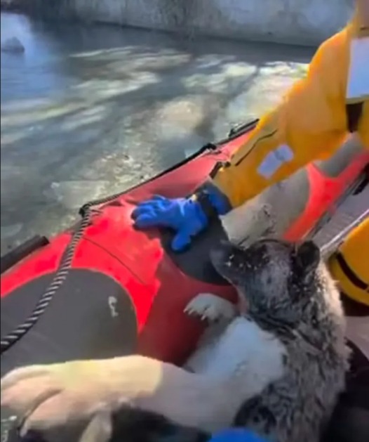 When the rescue team reached him, the dog didn’t know he was minutes away from being saved. He was exhausted, chilled to the bone, but alive — and that was the most important part. Using training, teamwork, and patience, the crew lifted him from the water and brought him to safety.