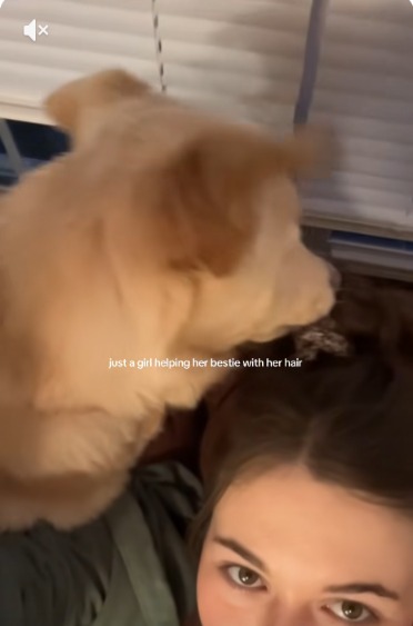 The video shows the light golden dog meticulously sectioning pieces of hair and gently pulling on them with her mouth.