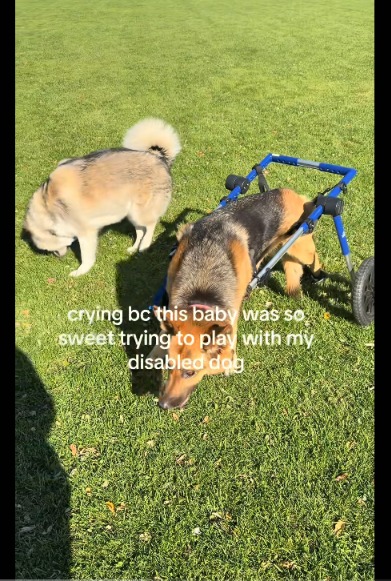 The wheelchair doesn’t define the German Shepherd. It doesn’t limit his joy. And the husky doesn’t see it as a barrier.