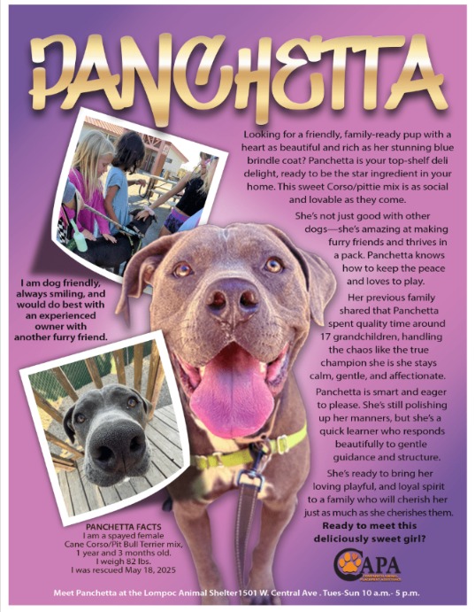 Panchetta is ready to trade her kennel for a kitchen floor and her shelter tag for a permanent spot in a family photo.