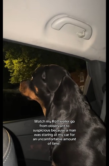 Her dog’s name is Mya. In the viral video, she transitions from relaxed to alert, watching a man staring at her owner’s car.