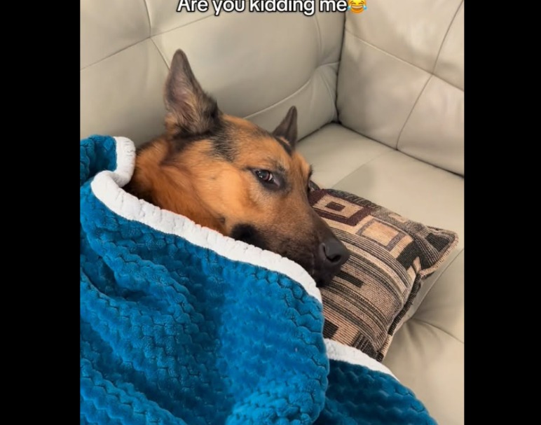 He isn’t moving an inch; he is doubling down on his nap, proving that even a powerful German Shepherd can be a “Velcro dog” when it comes to his favorite blanket.