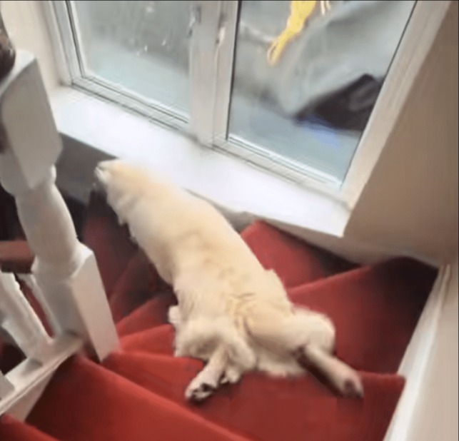 Every morning, like clockwork, a cheerful golden retriever named Tucker kicks off his day in the most delightfully goofy way imaginable—by sliding down the stairs on his belly.