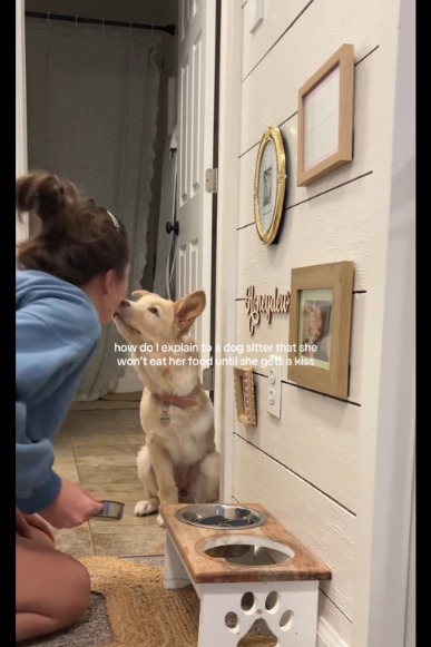 Instead, she sits. She waits. She stares lovingly at her human. Because for her, dinner doesn’t begin until she gets a kiss.