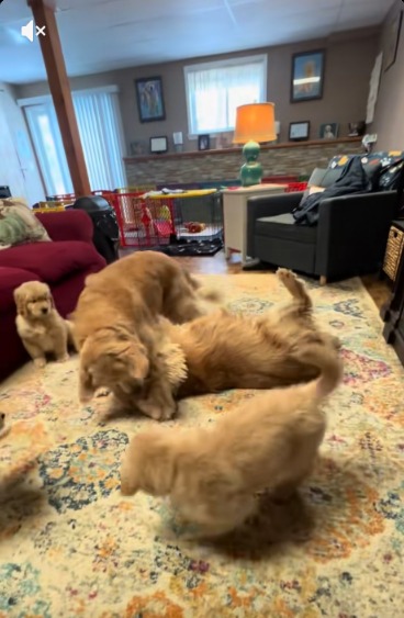 There’s playful, and then there’s “I’m still figuring out life but trying anyway” adorable — and that’s exactly what you get in a video of a litter of Golden Retriever puppies trying to imitate the wrestling moves of the adult dogs in their home.