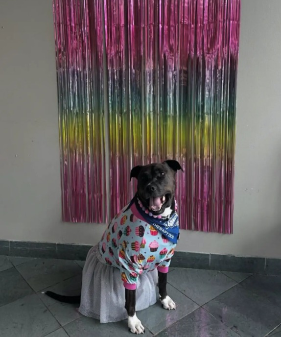 A video shared to Ashby’s Instagram page captured the sweet scene of students singing to her as she stood dressed for the occasion. She wore a sparkly tutu, a cupcake-themed onesie, a beaded collar and a pink crown. The festive outfit marked a shift for Stinson, who once insisted she would never dress her dog in clothing.