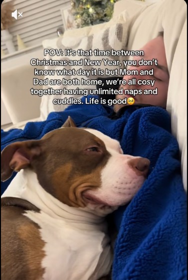 The star of that clip is Doug, a rescue Pit Bull who clearly treasures nothing more than being wrapped in the arms of the people he loves most. In the moments captured on camera, Doug settles into a cuddle session with his mom and dad, his body relaxing entirely as he basks in the comfort and affection they offer him.